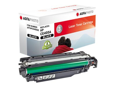 Produktbeskrivelse AgfaPhoto - svart - kompatibel - tonerpatron (alternativ for: HP 507A, HP CE400A) Produkttype Tonerpatron Utskriftsteknologi Laser Skriverfarge Svart Ytelse Inntil 5500 sider Kompatibel med HP Color LaserJet Enterprise MFP M575dn, MFP M575f; LaserJet Enterprise 500 M551dn, 500 M551n, 500 M551xh; LaserJet Enterprise Flow MFP M575c - Nedlastbare filer