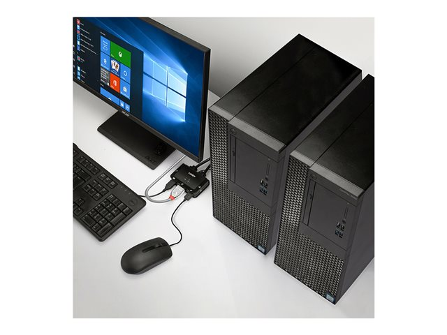 Support for resolutions up to 4096 x 2160 @ 60 Hz 4:2:0 8-bit, perfect also for graphical content in gaming setups, home working or dual system control workstations. The audio output port also allows users to connect headphones or speaker to add immersive 2CH audio and a microphone, while additional USB peripherals can be integrated with a USB hub. The KVM switch features multiple switching options including push buttons on the unit alongside hotkey and software switching to provide simple, reliable control for the user, great for both professional and first-time users.