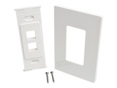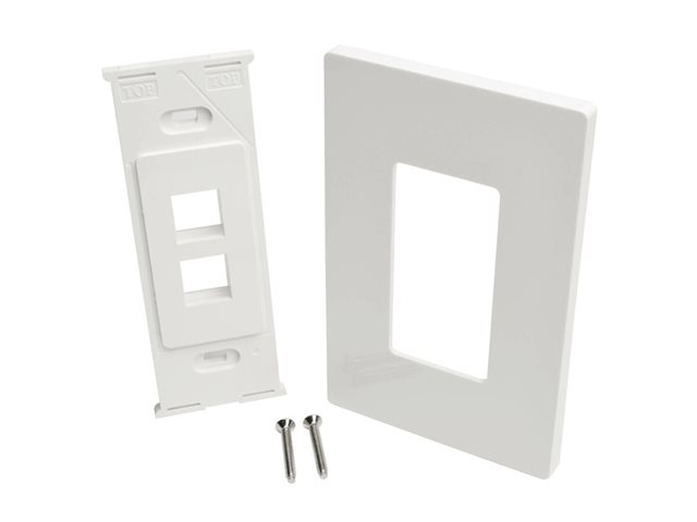 The N080-102 2-Port single-gang universal keystone wall plate provides a clean and simple method for connecting audio/video, voice and Ethernet cable lines at the wall. Any type of keystone jack, such as those used in Cat5e/6/6a, USB, HDMI, DisplayPort and RCA applications, snaps easily into the cutouts for quick cable connection. White color blends elegantly into any home or office décor for a sleek, professional installation. Made from high-impact polycarbonate. Fits any mid-sized or standard single-gang box. Includes two mounting screws for easy installation.