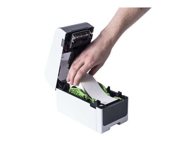 Tilkoblingsalternativene inkluderer USB 2.0, LAN og USB-vertgrensesnitt, noe som sikrer kompatibilitet med flere enheter. Skriveren har plass til ulike medietyper, som etiketter, kontinuerlige etiketter, utstansede etiketter og armbånd, noe som gir mange ulike bruksområder. Skriverens kompakte design kompletteres av en maksimal mediestørrelse på 6,3 cm og en maksimal utskriftslengde på 3000 mm, noe som gjør den funksjonell og plasseffektiv.